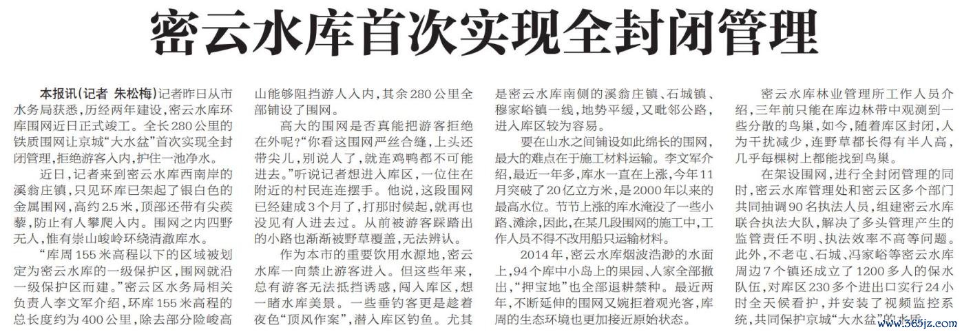 为更好地护住一池清水,2018年头,全长280公里的密云水库环库围网齐全,京城“巨流盆”初度齐全全封锁继续。密云区水务局相干负责东说念主先容,“库周155米高程以下的区域被规矩为密云水库的一级保护区,围网就沿一级保护区而建。”(2018年1月4日《北京日报》5版,《密云水库初度齐全全封锁继续》)