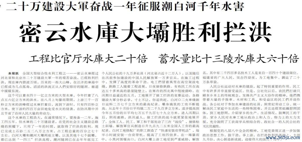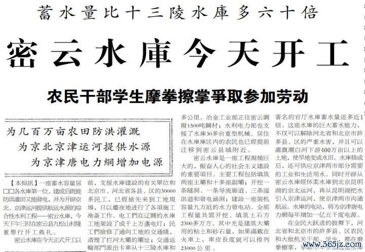 1958年9月1日,密云水库厚爱开建。在遐想蓝图上,密云水库的蓄水量达41亿立方米,比十三陵水库蓄水量多60倍、比怀柔水库蓄水量多40倍,兼具防洪、灌溉、给水、航运、发电的功能,除了修建两座主坝、十多个副坝,开挖两个隧洞和三条溢洪说念、尽头溢洪说念除外,还会在白河建一座装机容量9万千瓦、年均发电1.5亿度的发电站。(1958年9月1日《北京晚报》1版,《密云水库今天开工》)