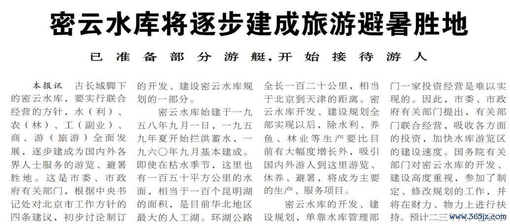 密云水库与长城相邻,容或优好意思,是我国华北地区最大的水库,素有“燕山明珠”之称,将其徐徐建成旅游避暑胜地,是其时行使环境资源为都门添彩的选拔。1980年春天,在水库白河大坝下的游船船埠,5艘各载客10东说念主至100东说念主的游艇初始买卖,搭客乘坐“北京一号”游艇遥看山光水色,仿佛是在“海上”飞翔。(1980年5月29日《北京日报》1版,《密云水库将徐徐建成旅游避暑胜地》)