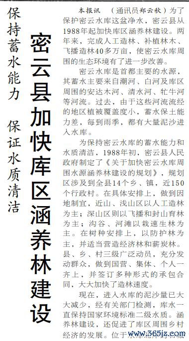 1988年,密云县加速了库区水源修养林建设。笔据策动,在近山、浅山区以东说念主工造林为主,深山区以飞播和封山育林为主,沟谷、河滩则以栽速生林为主。两年时代,40多万亩水源修养林建成,使参加水库的泥沙量大大减少,改善了周围生态环境。(1990年7月22日《北京日报》2版,《密云县加速库区修养林建设》)