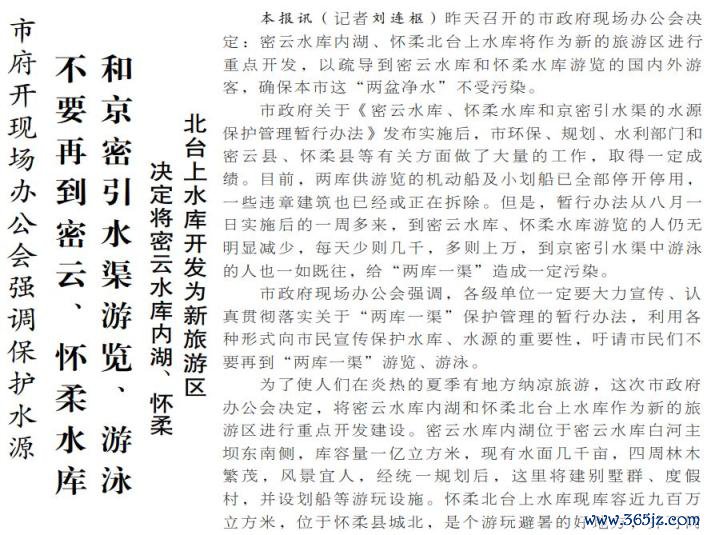 1985年,《北京市密云水库、怀柔水库和京密引水渠的水源保护继续暂行倡导》发布,轨则“两库一渠”保护区内辞谢一切沾浑水体的步履。同期,市政府作出决定,密云、怀柔两巨流库罢手发展旅游,并命令市民不再前去游览和游水。(1985年8月9日《北京日报》1版,《不要再到密云、怀柔水库和京密引水渠游览、游水》)